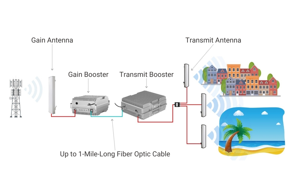 This advanced system utilizes a receiving booster to capture cellular signals, which are then transmitted via fiber optic cable to a transmit booster. The transmit booster amplifies the signal and distributes it through transmit antennas, ensuring extensive coverage and reliable connectivity.